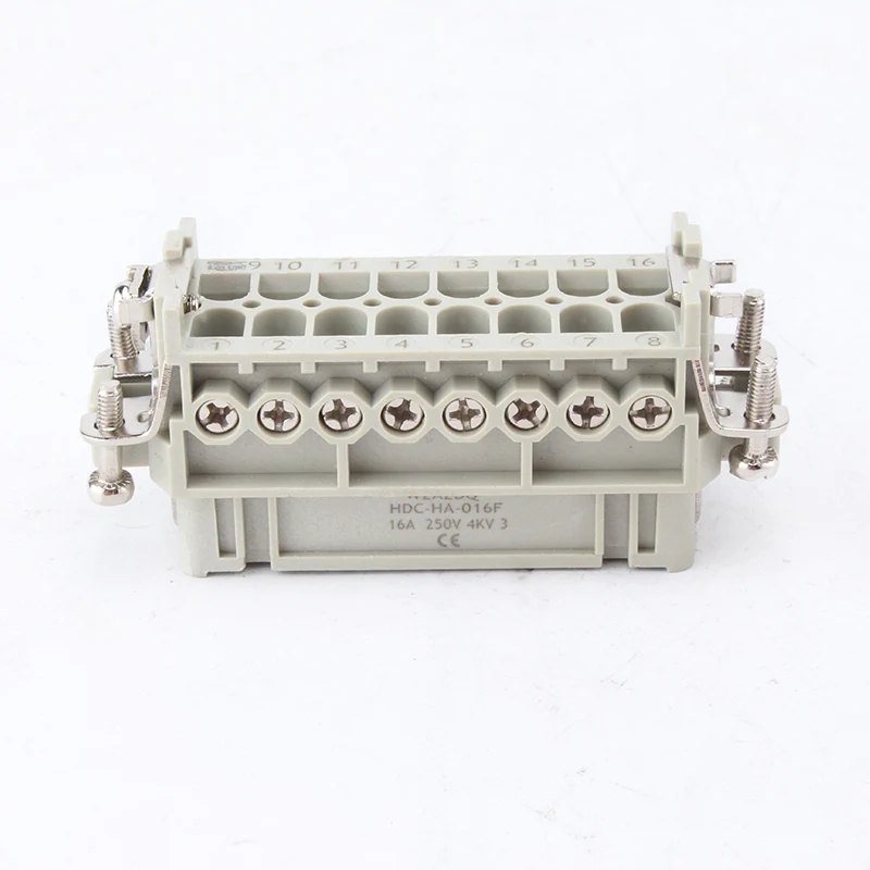 16A 10 Pin Insert Heavy Duty Connectors महिला र पुरुष निष्क्रिय भागहरू हुन्। HA-016-M र HA-016-F पुरुष र महिला भाग हुन्, तिनीहरू सेटको रूपमा एकअर्कासँग मिल्छन्। तिनीहरू H16A को एल्युमिनियम आवास संग सँगै काम गर्दै छन्। सम्मिलित कम्पोनेन्टहरू र बाहिरी आवास मिलेर पूर्ण कनेक्टर उत्पादन बनाउँदछ। तिनीहरू पीसी खोल र चाँदीको प्लेटेड पीतल पिनबाट बनेका छन्। सिल्भर प्लेटेड पिनहरूले यसलाई राम्रोसँग बिजुली जडान बनाउँदछ।