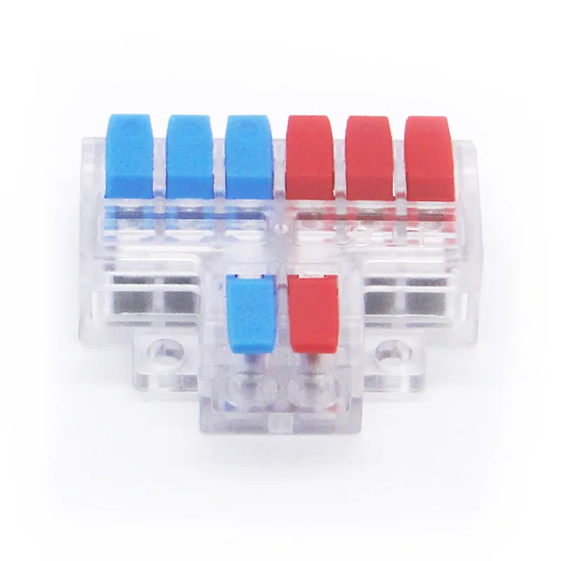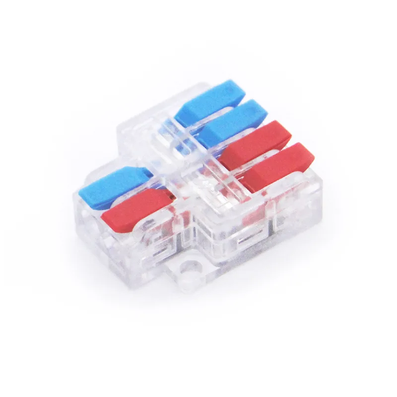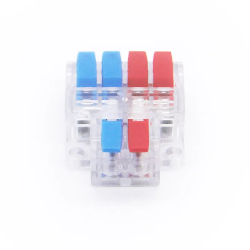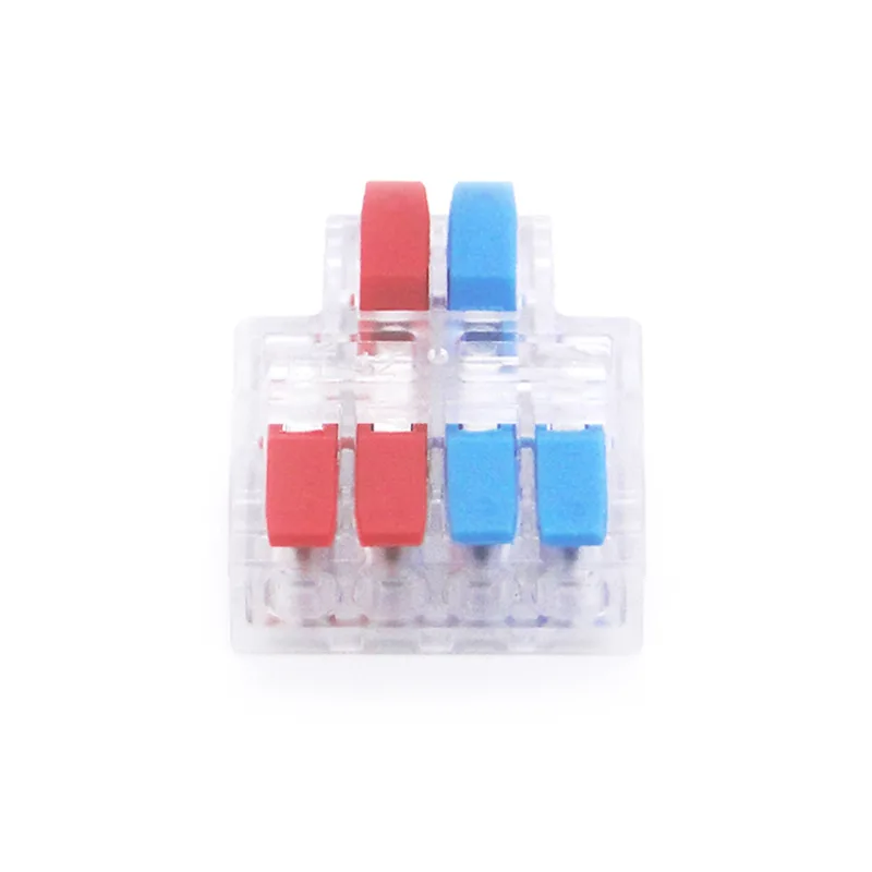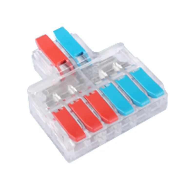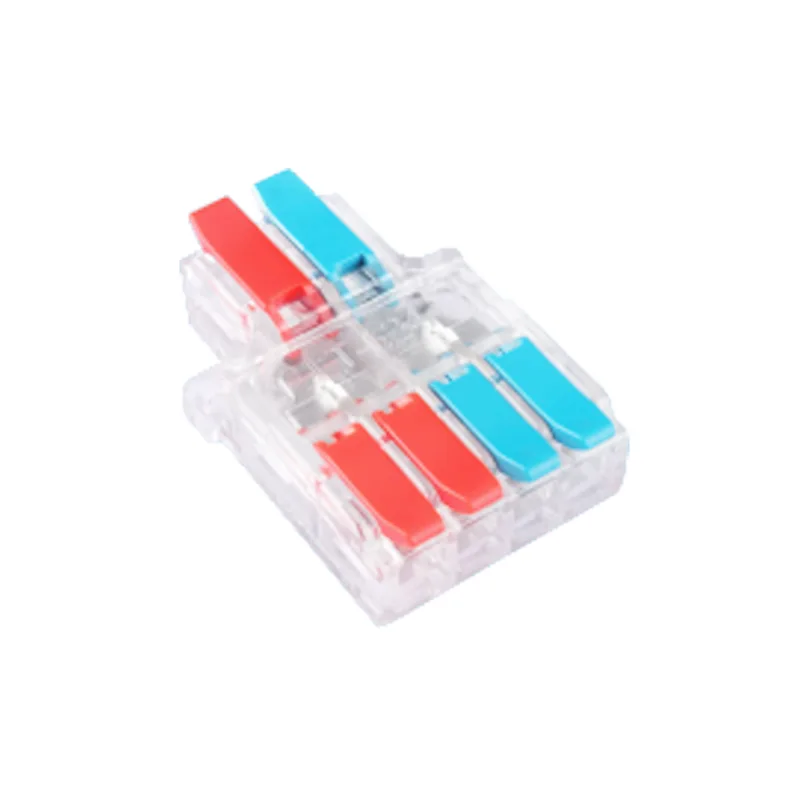 दुई-इन फोर-आउट स्प्लिसिङ तार द्रुत कनेक्टरहरू 6 वर्ग मिलिमिटरसम्म जडानहरूलाई समर्थन गर्ने, ठूलो गेज केबलहरूको लागि डिजाइन गरिएको छ। यसले 35 एम्पीयरसम्म करेन्टहरू ह्यान्डल गर्न सक्छ। तिनीहरू स्पष्ट रूपमा तारिङ मार्गहरू छुट्याउन विभिन्न रङका ह्यान्डलहरू प्रयोग गर्दैछन्।