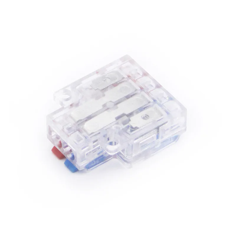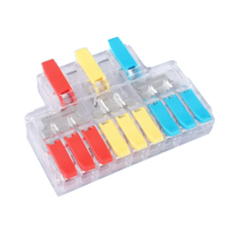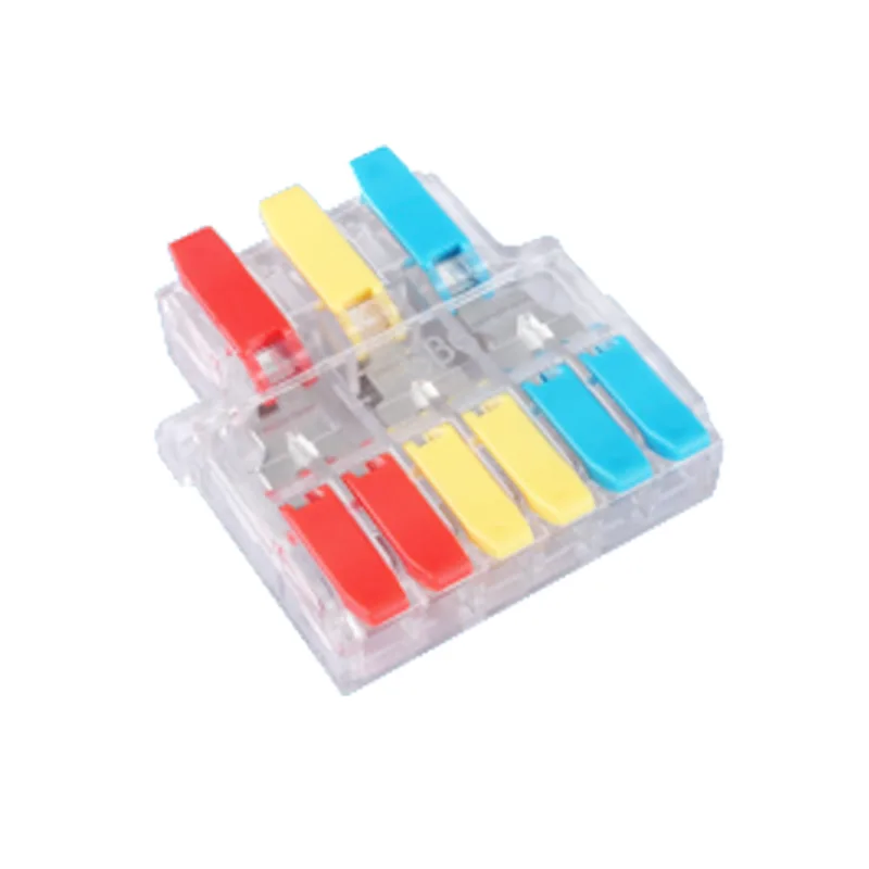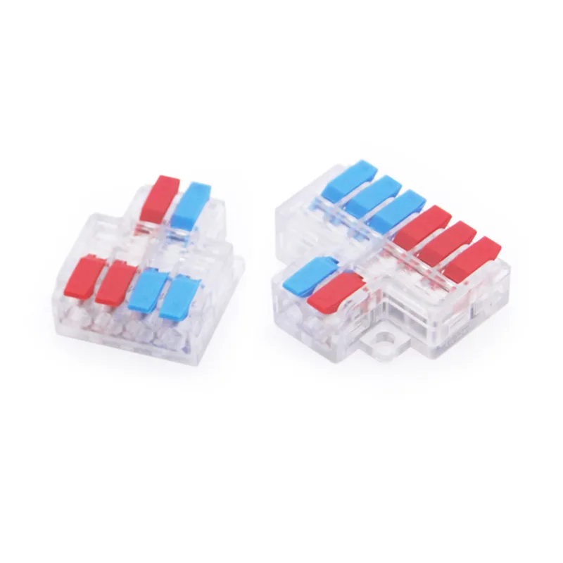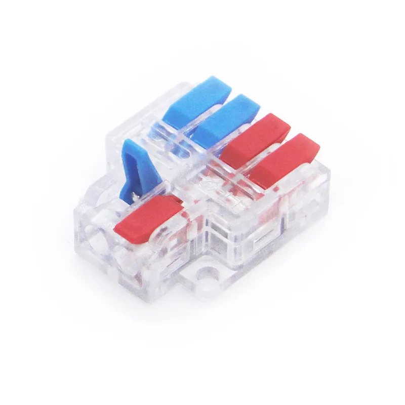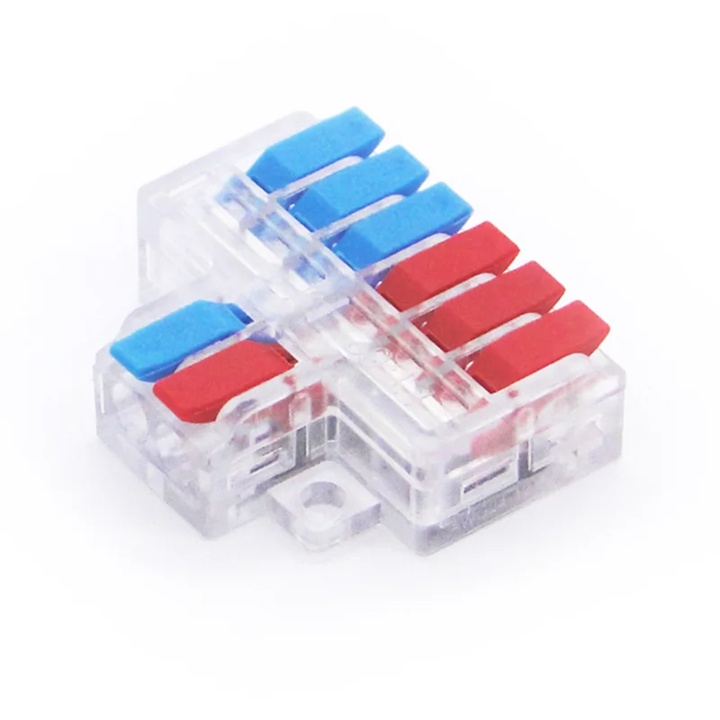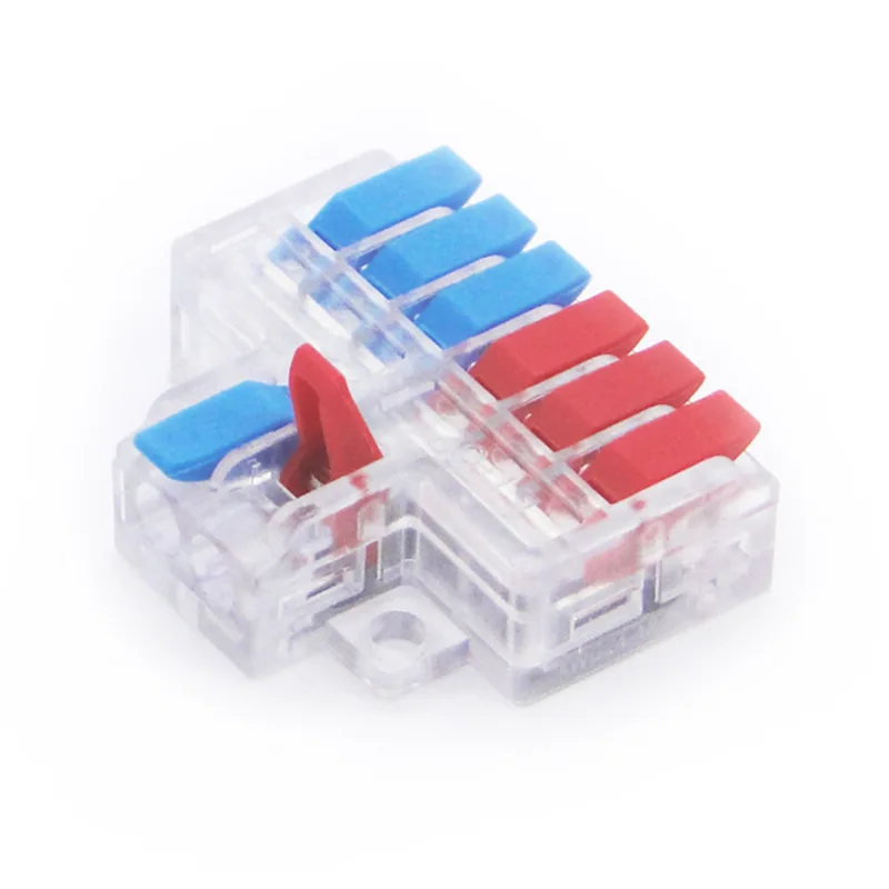 दुई-इन फोर-आउट स्प्लिसिङ तार द्रुत कनेक्टरहरू 6 वर्ग मिलिमिटरसम्म जडानहरूलाई समर्थन गर्ने, ठूलो गेज केबलहरूको लागि डिजाइन गरिएको छ। यसले 35 एम्पीयरसम्म करेन्टहरू ह्यान्डल गर्न सक्छ। तिनीहरू स्पष्ट रूपमा तारिङ मार्गहरू छुट्याउन विभिन्न रङका ह्यान्डलहरू प्रयोग गर्दैछन्।